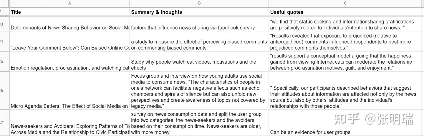 收集文献,早期我用Mendeley,后来图方便我就直接用Google Sheets了。每做一个项目,我会把找到的相关文献都列在一个文档里:标题,简要,以及对我的项目有什么帮助。比如下面这个是我做和新闻阅读习惯相关项目时 ,这里的一个表格。