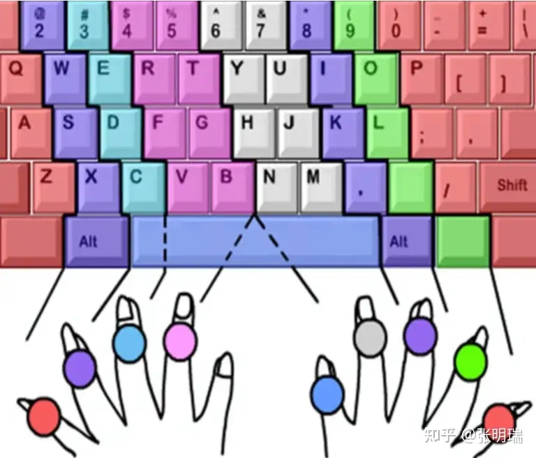 十根手指对应QWERTY布局,标准的指法是什么样呢?看看和你的习惯一不一样: