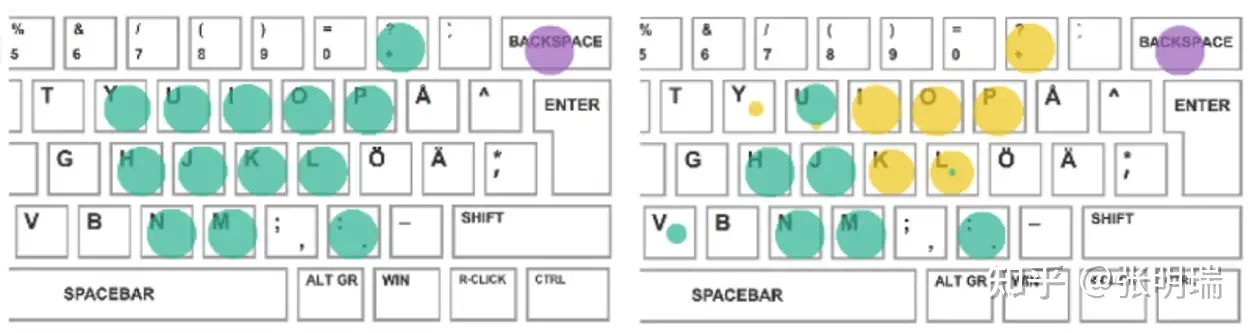 芬兰有一帮研究人员闲得无聊,就拍了一群人在键盘上打几个小时的字,然后分析他们的手指运动 [2]。结果发现,在他们找的人里,没几个人指法一摸一样的。比如一些人用右手的时候,只会用食指,有些人只会用到中指+食指。而且那些用手指比较少的人,一般都没法盲打:他们需要看手指落在了哪里,所以目光会在键盘和屏幕之间 反 复 横 跳。