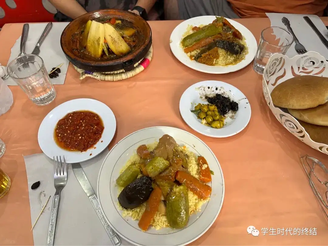(摩洛哥特色的食物,左上角是用蔬菜砂锅 Tajin,剩下两个是 Cous-cous,肉和蔬菜放在焖的小米上,味道其实并不丰富,也不难吃