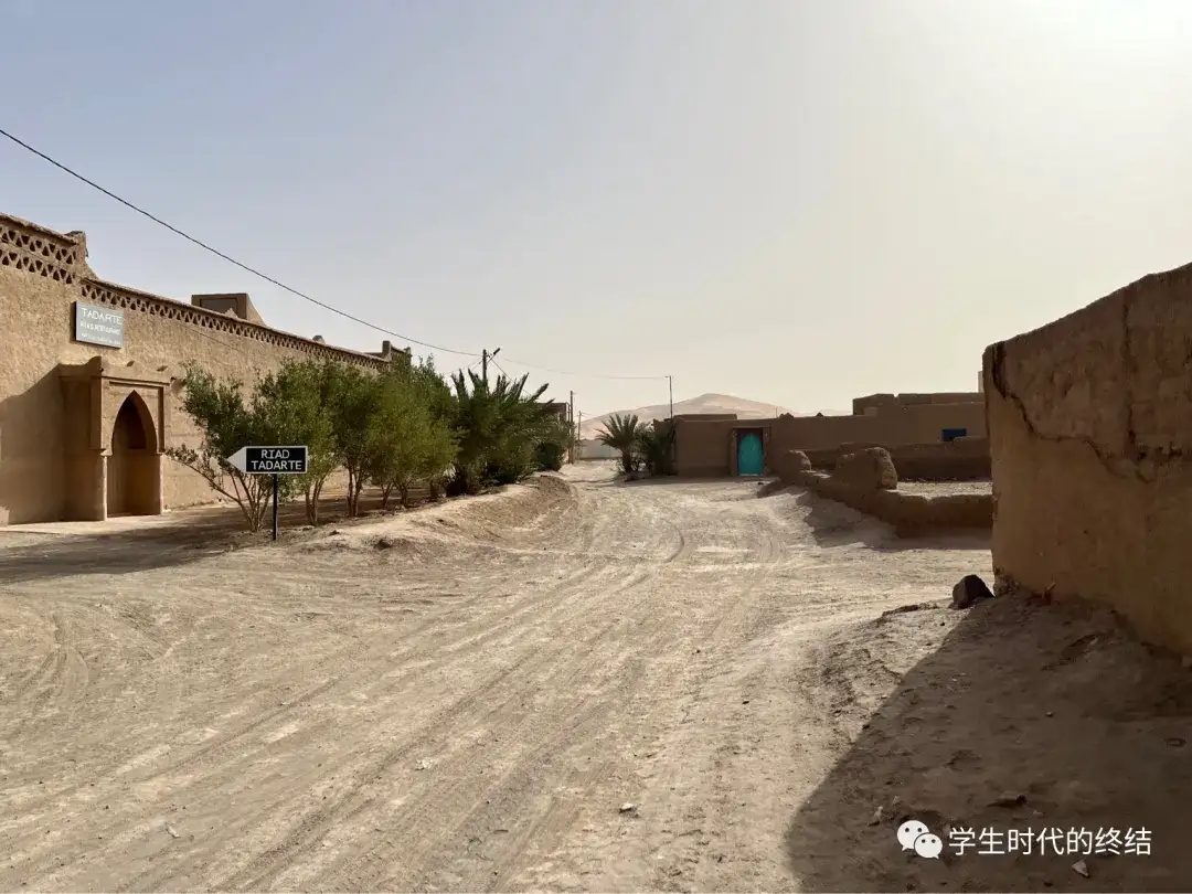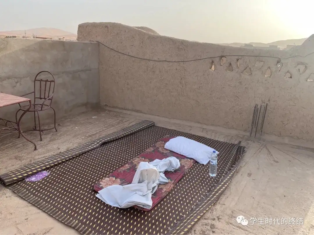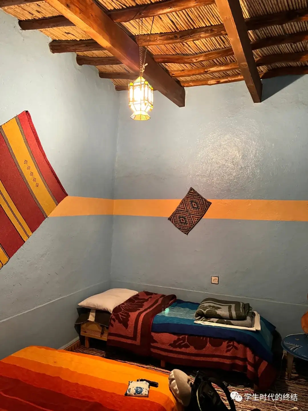 (我的房间,即使夜晚也闷热得像蒸桑拿 Houssan说自己家以前过着牧民生活,在沙漠里到处游走,靠放养骆驼和羊为生。几十年前摩洛哥和阿尔及利亚的国境管控变严,人们没法自由地在沙漠里穿行,就在这个沙漠附近的小镇定居下来。小镇上有五百左右人口,大多是之前从事游牧事业的人,现在大都做和旅游业相关的工作,比如餐厅,小商铺,旅游代理。Houssan是代理,接待游客去沙漠,安排项目,环游摩洛哥不同城市。这两年疫情减少了许多客流量,很多人都到隔壁城市打工去,种地,盖房,或者运货。 很难想象在这种炎热气候下人们如何工作和生活。时间到了,Houssan的父亲从凉席上站起来,朝某个方向跪拜,应该是伊斯兰教的仪式。我喝着他们的热茶(Houssan告诉我说是中国的绿茶加上方糖,看着小孩子在夜间的院子来回奔跑,想到以前夏天一家人铺凉席在地上开着电扇睡觉的场景。 这次旅行非常奇怪的地方在于,许多陌生国度的场景总会勾起深藏在脑子里的小时候的记忆。(当然,当记忆涌现时也知道来对了地方