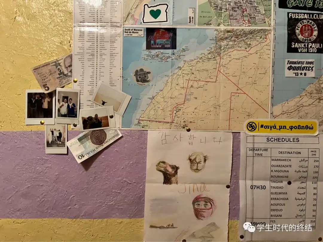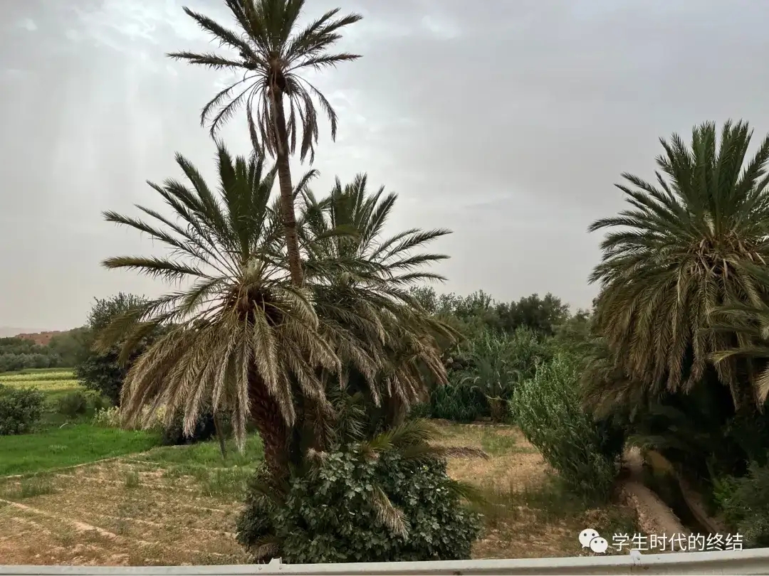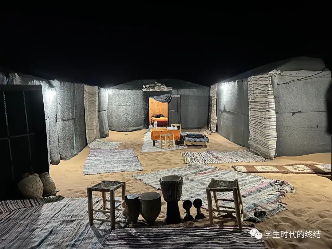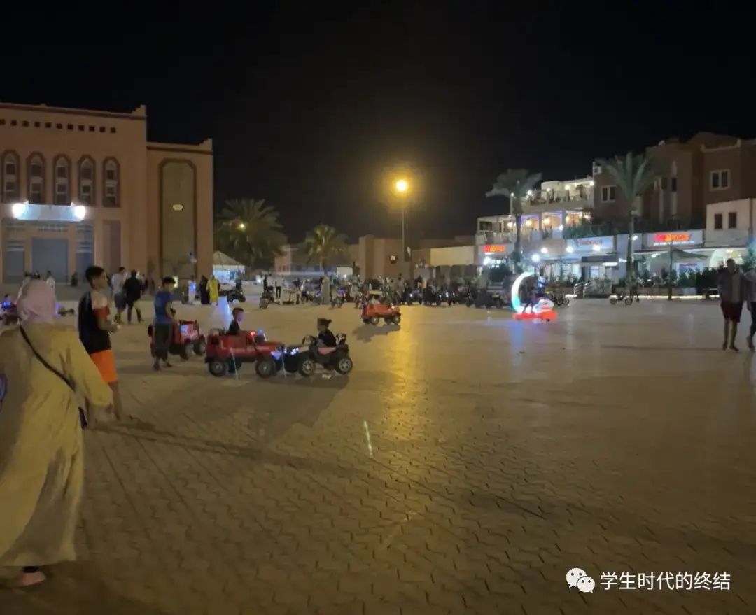 (我的房间,即使夜晚也闷热得像蒸桑拿 Houssan说自己家以前过着牧民生活,在沙漠里到处游走,靠放养骆驼和羊为生。几十年前摩洛哥和阿尔及利亚的国境管控变严,人们没法自由地在沙漠里穿行,就在这个沙漠附近的小镇定居下来。小镇上有五百左右人口,大多是之前从事游牧事业的人,现在大都做和旅游业相关的工作,比如餐厅,小商铺,旅游代理。Houssan是代理,接待游客去沙漠,安排项目,环游摩洛哥不同城市。这两年疫情减少了许多客流量,很多人都到隔壁城市打工去,种地,盖房,或者运货。 很难想象在这种炎热气候下人们如何工作和生活。时间到了,Houssan的父亲从凉席上站起来,朝某个方向跪拜,应该是伊斯兰教的仪式。我喝着他们的热茶(Houssan告诉我说是中国的绿茶加上方糖,看着小孩子在夜间的院子来回奔跑,想到以前夏天一家人铺凉席在地上开着电扇睡觉的场景。 这次旅行非常奇怪的地方在于,许多陌生国度的场景总会勾起深藏在脑子里的小时候的记忆。(当然,当记忆涌现时也知道来对了地方