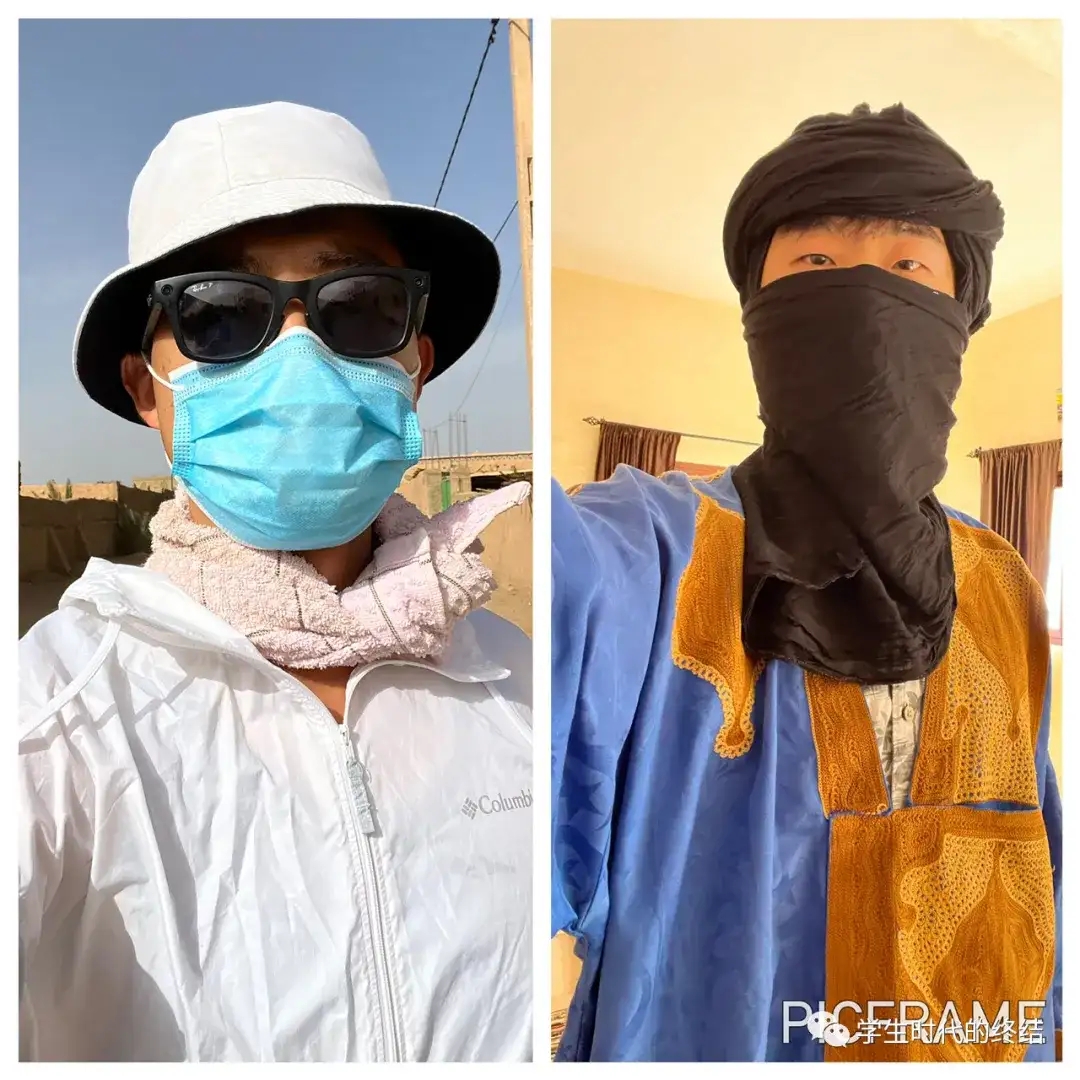 (屋顶可以看到许多星星闪来闪去 第二天就要出发去撒哈拉,Houssan告诉我晚上等日落出发,还可以穿上他们的传统服装抵御阳光和风沙。我兴高采烈地穿上,顺带学了一下包头巾的方法,不比当初学系红领巾简单多少。