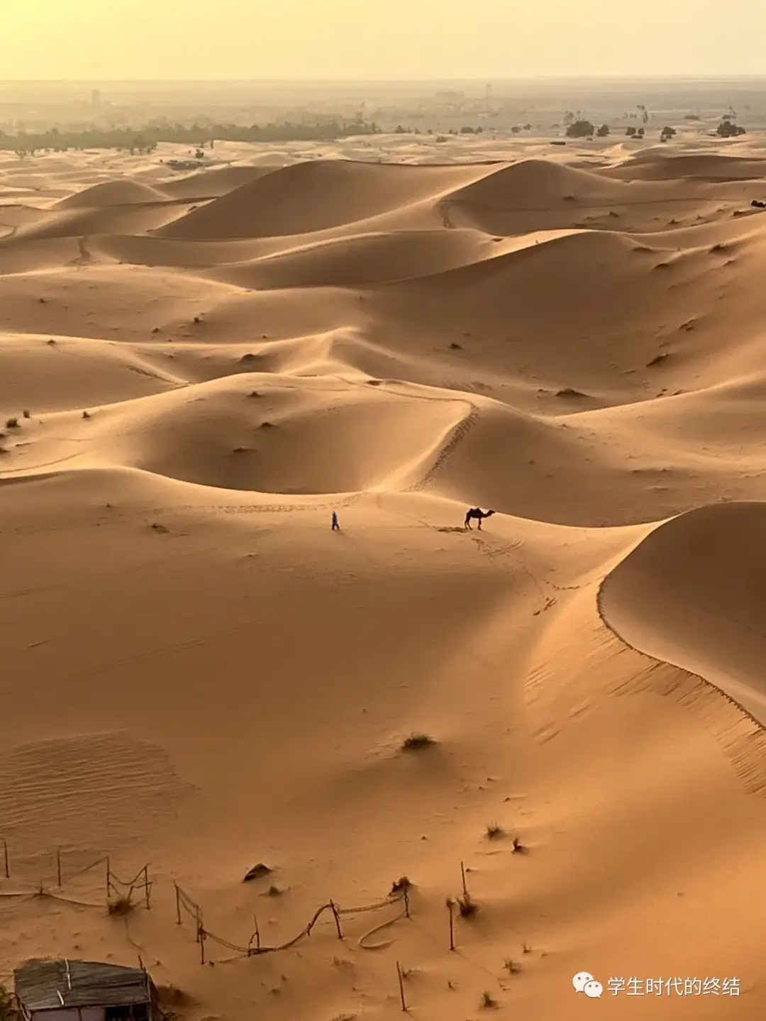 (穆罕默德把线系在骆驼牙齿上,在前面领着骆驼走 大概走了一个小时,我们已经到沙漠深处了。放眼望去是各种沙丘,落日时分显得非常苍美和壮阔。但天空并没有像电影特别清晰,风把细小的砂砾吹起来,浑浊的天空稀释了夕阳的光芒,变得一片灰黄。