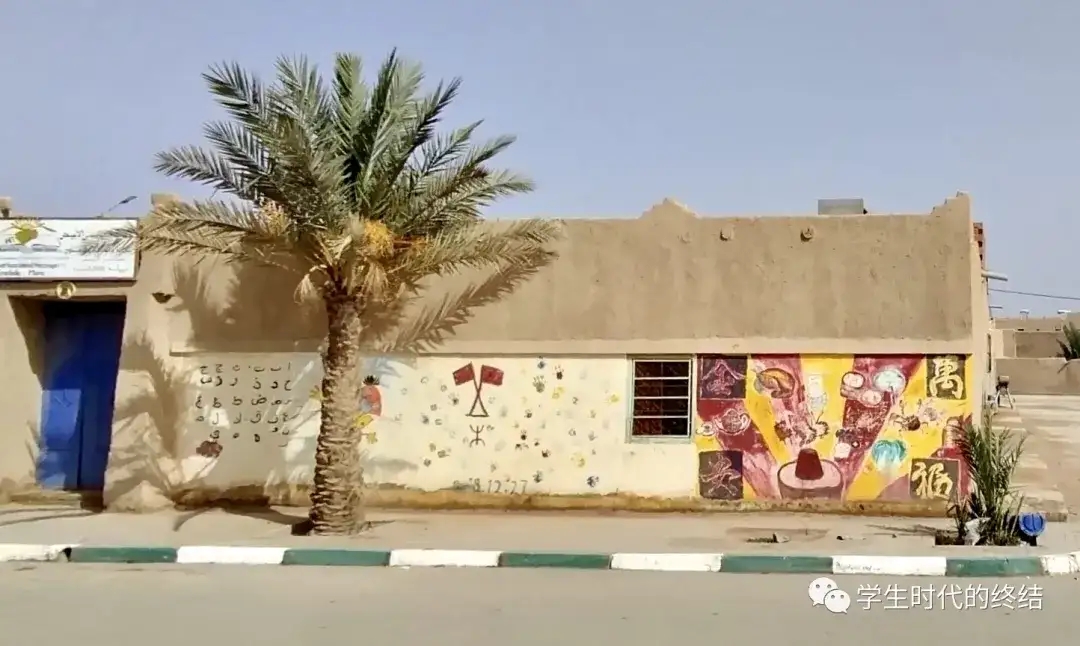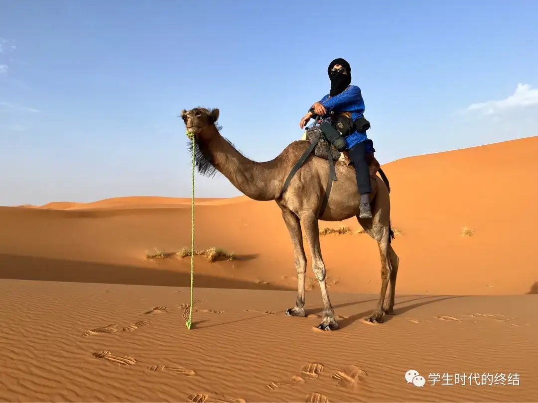 (找到一栋外墙画有中文的建筑,问一问旁边休息的大爷,告诉我说是志愿者们画的,来自世界各地的年轻人来这里住几个月,同当地人一起干活,有时带小孩子们上上课 下午快日落的时候,Houssan叫上我,说 ”今天没别人,就带你一个去沙漠!一会儿穆罕默德先带你看日落,然后我们到帐篷里过夜“。我们坐上沙漠越野车,开到城外,成群的骆驼在休息。穆罕默德穿着一身蓝色长袍,正牵着一头骆驼向我走来。近了,他让骆驼停住,口中说了两声命令,按了一下骆驼长长的脖子。骆驼随即发出一声惨叫(不知道是不是正常的叫但听起来很惨,吐了口口水先弯下前腿,接着弯下后腿,趴在地上等我上座。