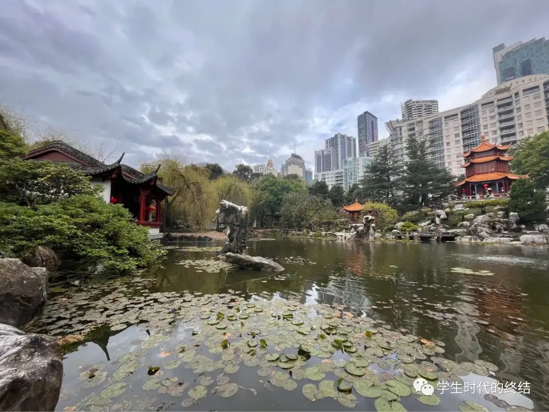 (花园的亭子和水池在高层建筑的映衬下十分有雅韵