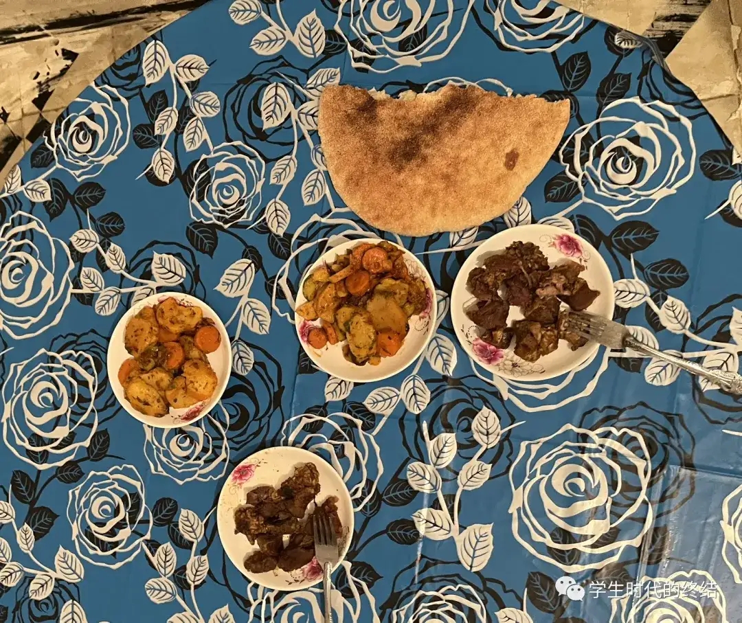 (Adil妈妈的手艺很棒,晚饭是面饼和牛肉丝,牛肉吃起来焦嫩,要用饼蘸在油里夹起来吃