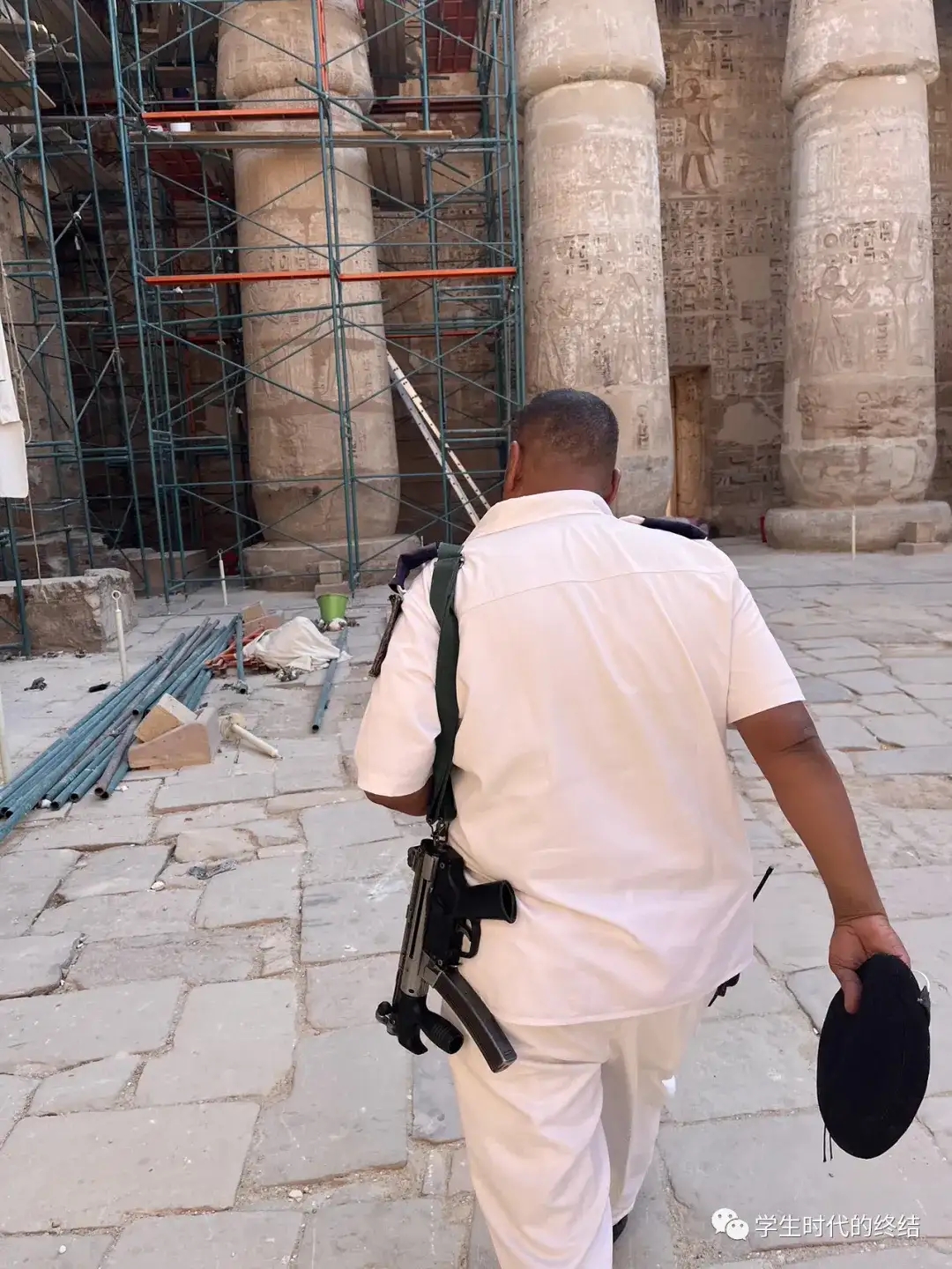 Taha还没回答完后两个问题,就被叫去给一个西班牙旅行团做导游。他委托身边一个军人带我到处转转,说我是他一位朋友,不要随便收钱。我们约好他导游结束再见,一起到附近喝点东西继续聊。 于是我就经历了很奇特的游览体验:这位大腹便便的军官,带着一把微冲,带我在庙里逛,顺便对着壁画指指点点,像小孩儿一样对我说这个好看,那个稀奇,我怀疑他到底了不了解这里的建筑。